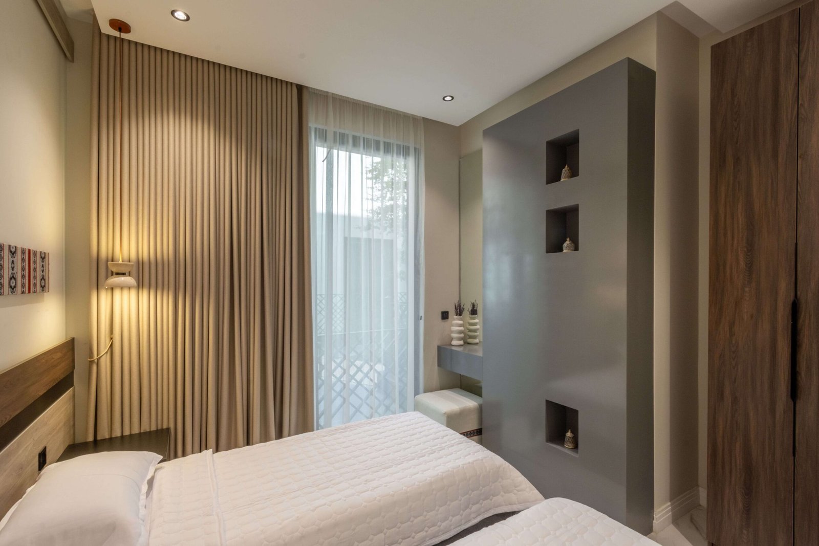 ثلاث غرف نوم (غرفة بسرير ملكي ووغرفتين كل غرفة فيها سريرين مفردة) وثلاث حمامات، بالإضافة لغرفة خادمة بحمام خاص. حمّامين فيهم شاور.