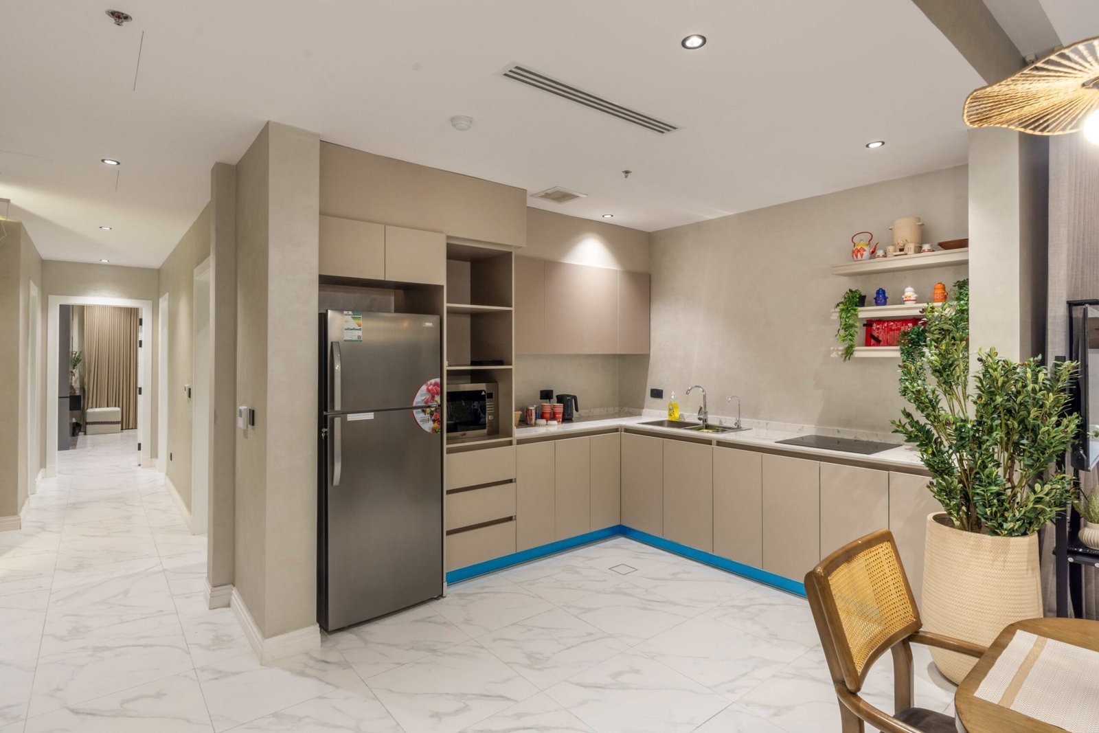 - مطبخ مجهز بالكامل مع ثلاجة، فرن، ميكروويف، وغسالة صحون